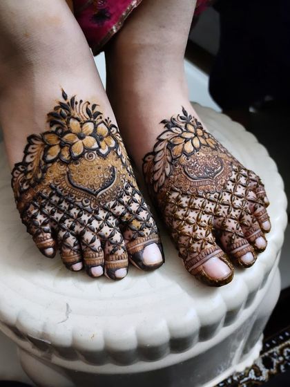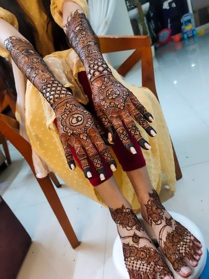 For the bride who wants the complete traditional look. I create full, matching designs that flow from your hands and arms all the way to your feet, ensuring you look perfect from every angle on your big day.
