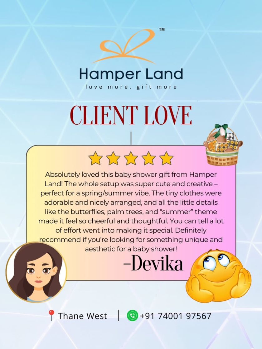 I design adorable hampers to celebrate new arrivals and moms-to-be. My services include themed baby shower centerpieces, cute announcement gifts for family and friends, and charming return gifts for guests, all of which can be customized and ordered in bulk.