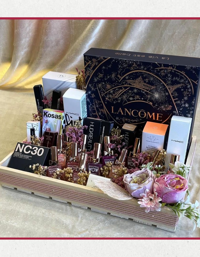 I curate luxurious hampers for the makeup and skincare lover in your life. These collections feature products from premium brands like MAC, Lancôme, and Lakmé, beautifully arranged in elegant trays and boxes, making it the perfect gift for a bride, a birthday, or just to pamper someone special.