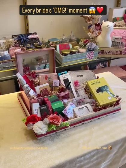 This is the first look at what I do best: creating stunning, personalized wedding gifts that tell your story. From grand trousseau displays to thoughtful welcome hampers, this collection shows the craft and care I put into making your big day unforgettable.