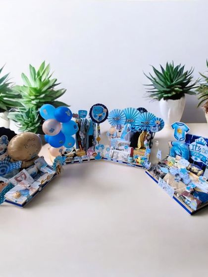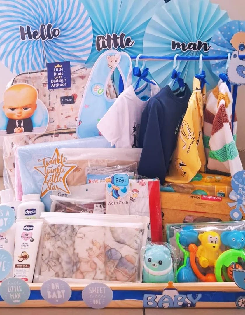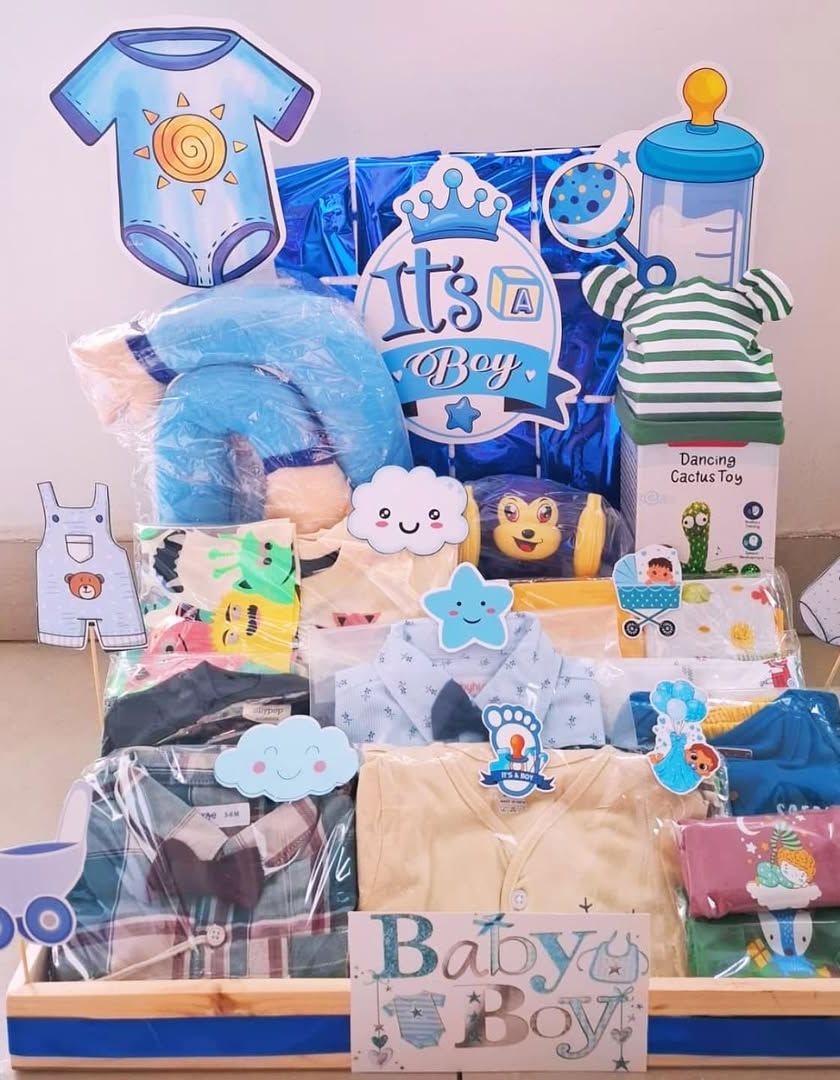 Celebrate his arrival with a hamper curated just for him. I fill these with baby boy essentials like blue and neutral-toned clothing, skincare, toys, and personalized decorations to make his welcome extra special.