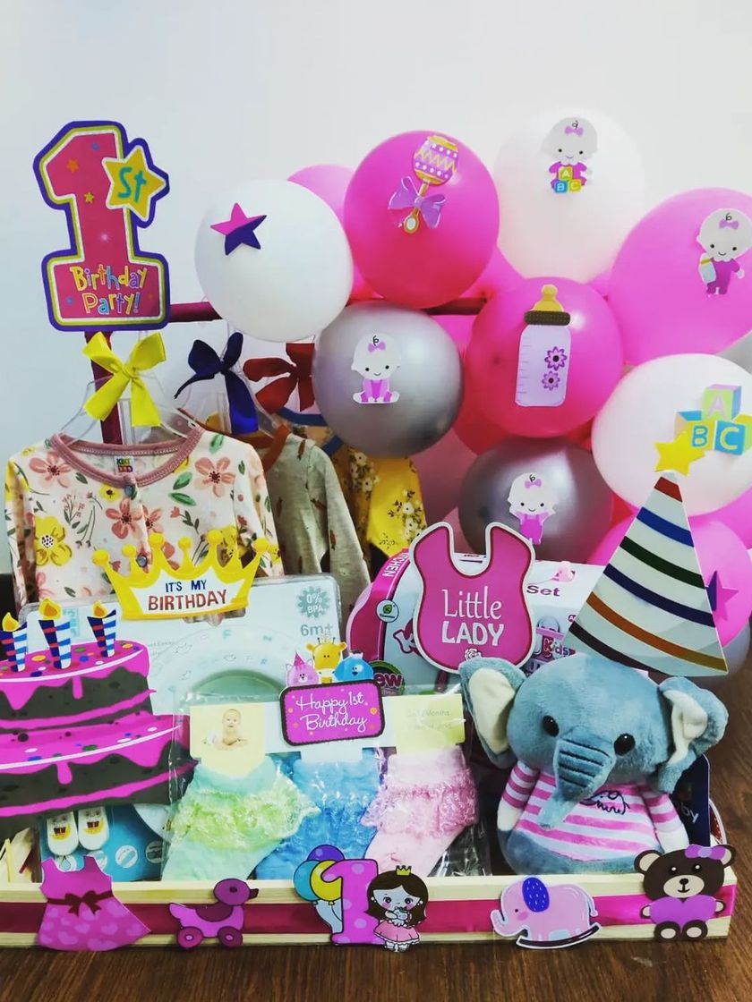 The celebrations don't stop after the arrival. I also design hampers for other big moments, like your baby's very first birthday, filled with everything you need for a memorable party.