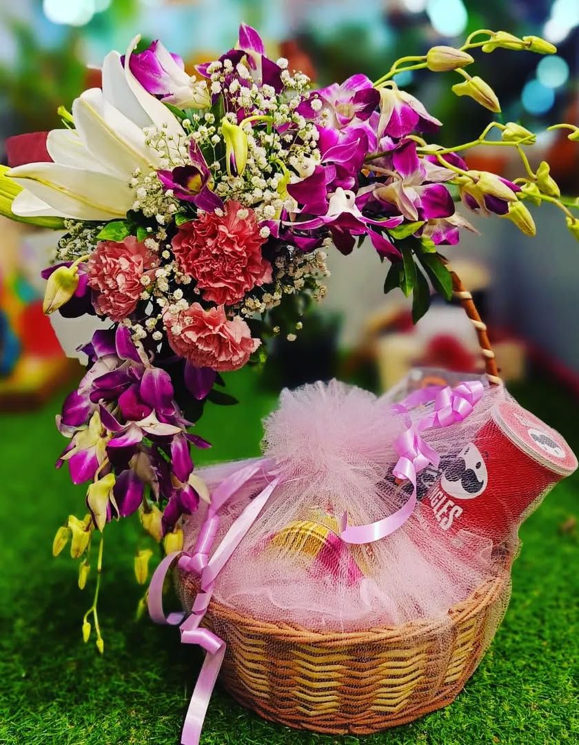 Beyond festivals, I also create beautiful gift baskets for any occasion. This one features a mix of fresh flowers and tasty goodies, perfect for birthdays, anniversaries, or just to show someone you care.