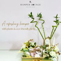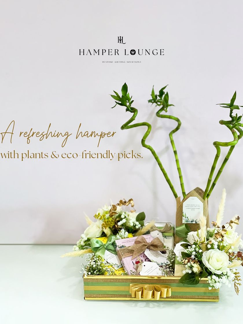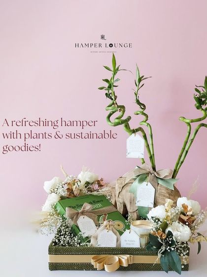 For a gift that promotes well-being and sustainability, I offer a range of eco-friendly hampers. These gifts feature items like lucky bamboo, fresh plants, and sustainable goodies, all presented in natural and reusable packaging like jute-accented trays.