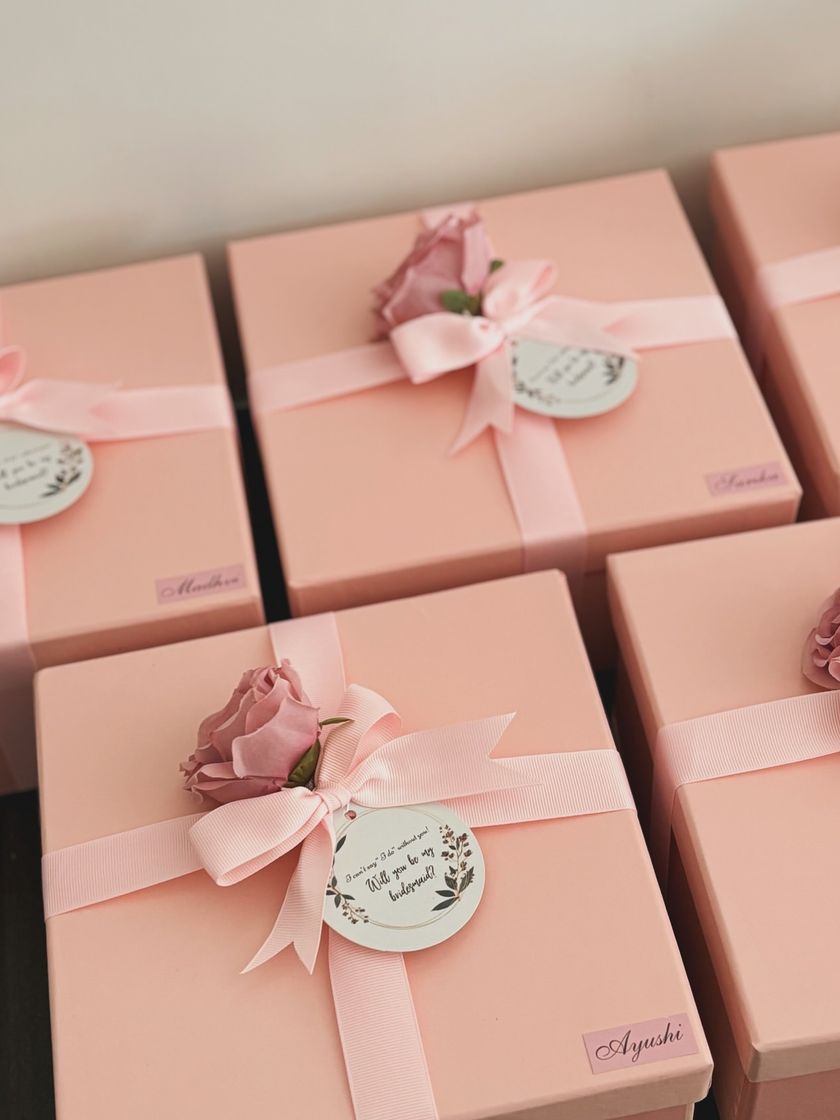 Asking your best girls to stand by your side is a huge moment! I create personalized proposal boxes and baskets filled with goodies they'll actually love, from custom robes and skincare to their favorite treats. Let's make your squad feel cherished and celebrated.