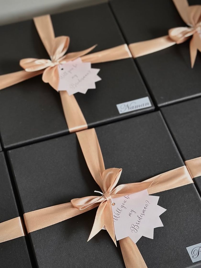 Let's not forget the guys! I design sleek and practical gift boxes to propose to your groomsmen and bridesmen. Think personalized flasks, premium grooming kits, and maybe a miniature of their favorite spirit to get the celebration started.