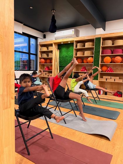 We believe yoga should never feel like homework. We use props like chairs, blocks, and wheels to make asanas more accessible, fun, and challenging, helping kids explore movement in creative ways.