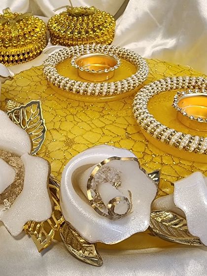 Light up your celebrations with my handmade festive decor. I create elegant resin puja thalis, beautiful tealight candle holders in various themes like floral and ocean, and custom hangings like Shubh Labh for Diwali. Each piece is crafted to add a special touch to your festivals and can be customized in your favorite colors.