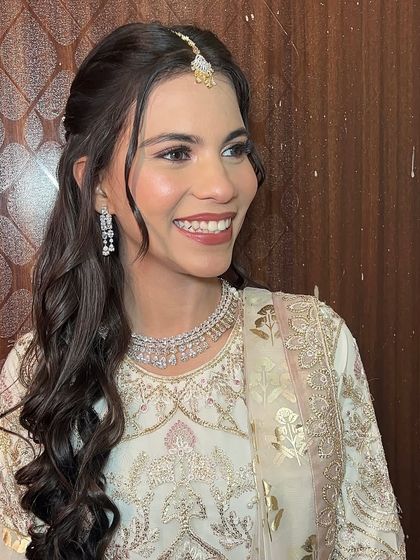 I specialize in creating modern bridal looks that blend current trends with timeless elegance. My signature style includes techniques like glass skin finish, glossy lips, and glitter eyeliner while ensuring the makeup complements traditional bridal attire and jewelry.