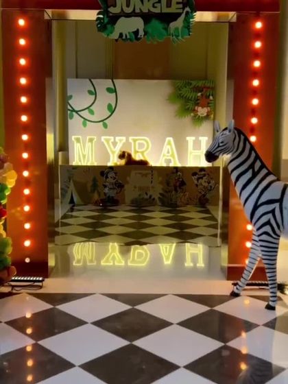 I use custom backdrops, personalized party backdrop designs, balloon garlands (organic style!), 3D/4D props, neon lights, low picnic tables, dessert stations - all the stuff that makes your yaadein (memories) feel special.