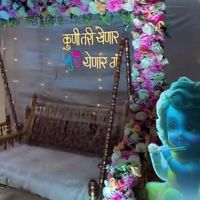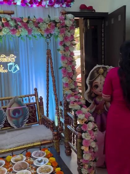 I create beautiful and authentic Godh Bharai (baby shower) stages using the traditional Sankheda Jhula (swing). These setups can be arranged in large halls or cozy homes, often featuring floral decorations and custom Marathi neon signs.