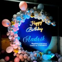 For a more contemporary celebration, I design stylish backdrops perfect for photos. This includes popular circular ring frames with balloon garlands and neon signs, as well as custom floral walls and themed setups.
