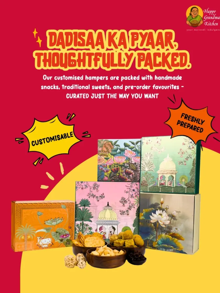 We help you share the warmth of home during festivals and corporate events. Our customisable hampers, filled with handmade Marwadi snacks and sweets, are perfect for Diwali, Lohri, Christmas, or as thoughtful gifts for clients and teams.