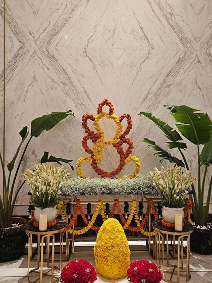 I provide elegant decor for corporate spaces to celebrate festivals or welcome guests. This includes floral installations for lobbies and entryways, like this traditional Ganesh Chaturthi setup for a welcoming and auspicious atmosphere.