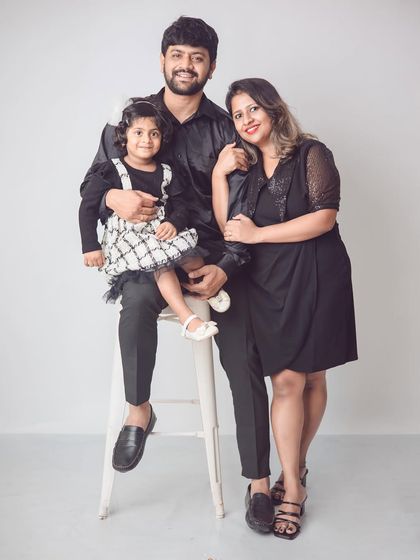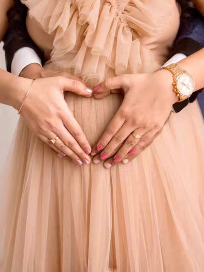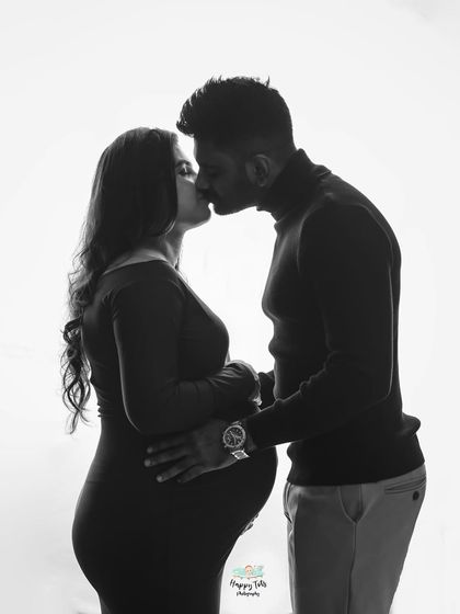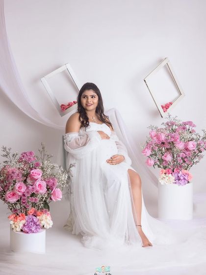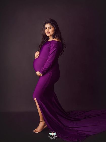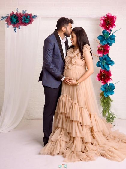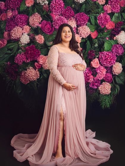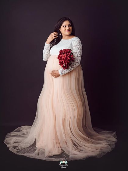 I do maternity shoots in my Bangalore studio with a choice of gowns, different themed setups, hair and makeup included, and I guide you through all the poses.