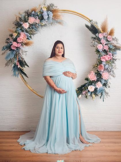 I’m a bit obsessed with gowns, not gonna lie. You’ll get to pick from my whole collection - flowy dresses with long trains, lacy sleeves, strapless, whatever suits you. There’s soft pastels, classic whites, bold shades, all ready for your maternity photoshoot. We handle hair and makeup too, so you don’t have to stress.