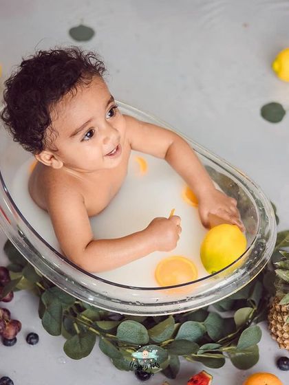 Our milk bath sessions are a huge hit with babies and parents. It's a wonderful sensory experience that almost always guarantees smiles and splashes. We use a safe, warm, shallow bath and add colorful fresh fruits or flowers for a vibrant and unique photoshoot that is as fun to make as it is to see.