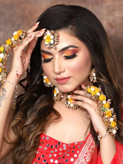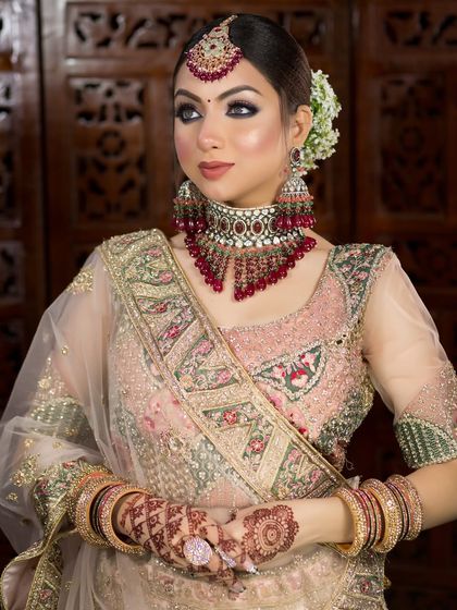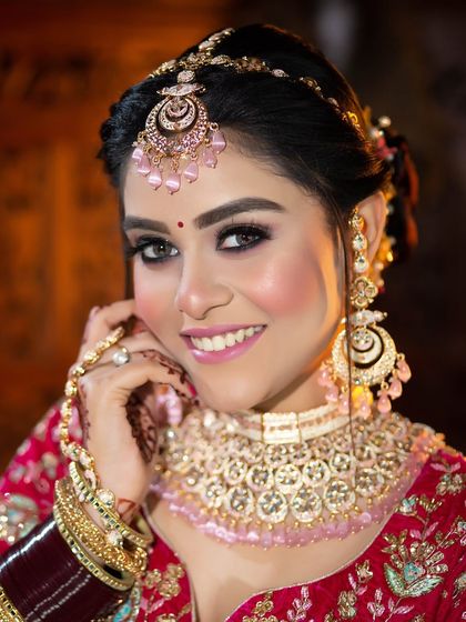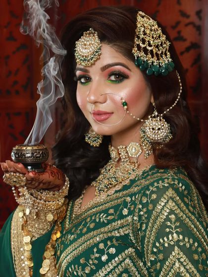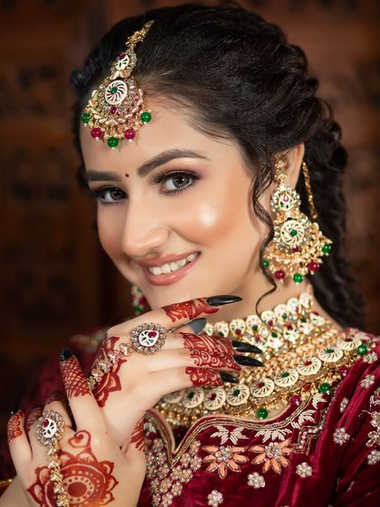 I do bridal makeup and hairstyling for all wedding events using HD and airbrush techniques, with looks customised for each function and the option to get ready at my Gurgaon studio or your venue.