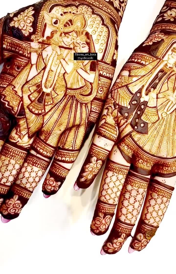 For brides who want to carry blessings with them, I create designs featuring divine figures. Radha Krishna is a very popular theme, symbolizing eternal love. I also design beautiful depictions of Shiv Parvati, Lord Ganesha for auspicious beginnings, and other spiritual motifs.