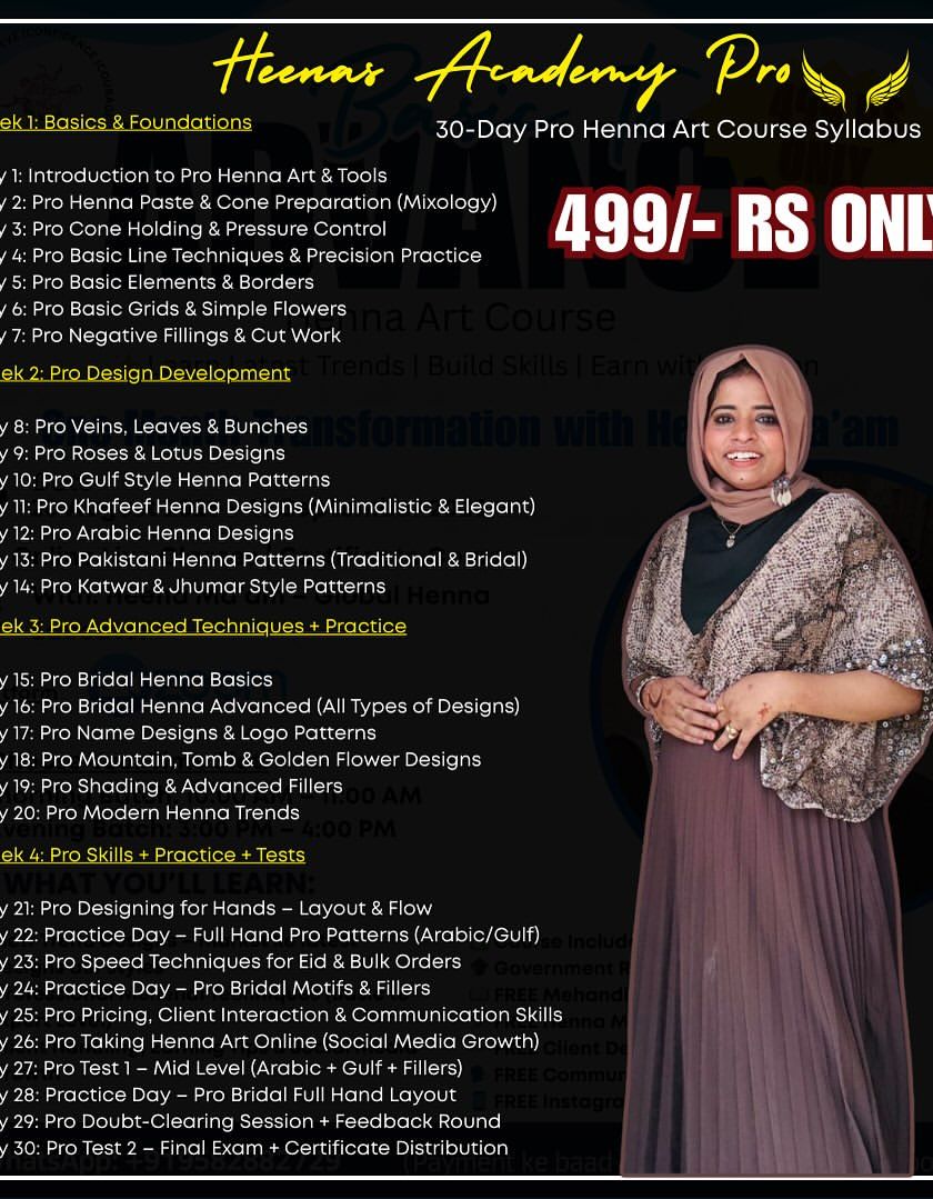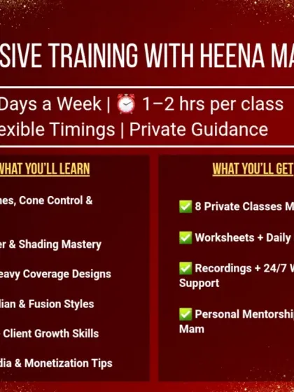 This is a handpicked selection of my work, courses, and my teaching style. It gives you a glimpse into how I can help you transform your passion for henna into a professional skill and become financially independent.