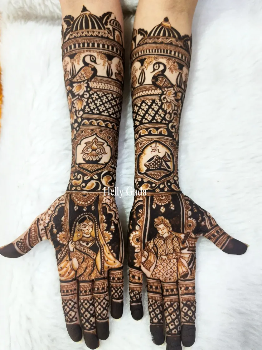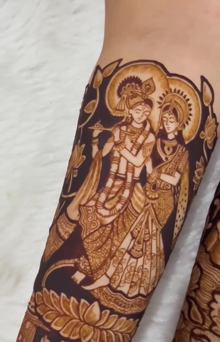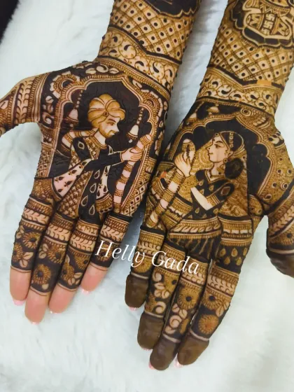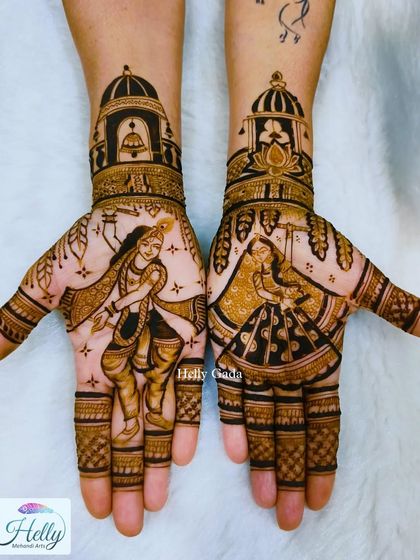 Mehndi is a spiritual art for me, and I love creating designs that carry blessings. I draw detailed figures of deities like Radha Krishna and Shiv Parvati, incorporating sacred symbols to bring a divine touch to your special day.