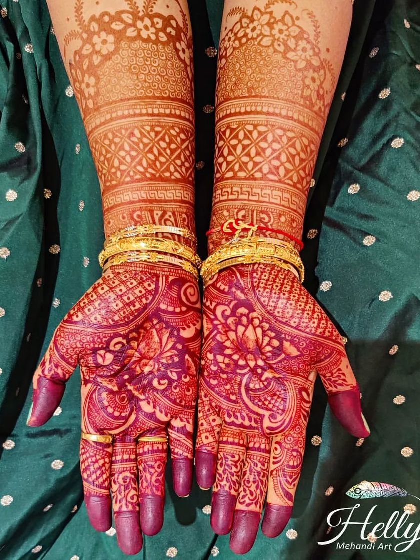The final color is everything. I use my own specially prepared, 100% natural henna cones that guarantee a deep, rich, and long-lasting stain, which develops beautifully over 24 to 48 hours. I also offer instant red mehndi for those in a hurry.