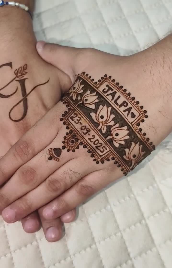 Mehndi is a celebration for everyone. I offer a range of stylish designs for grooms and their families, from elegant initial monograms and important dates to detailed couple portraits or fun motifs like 'Dulhan ka Bhai'.