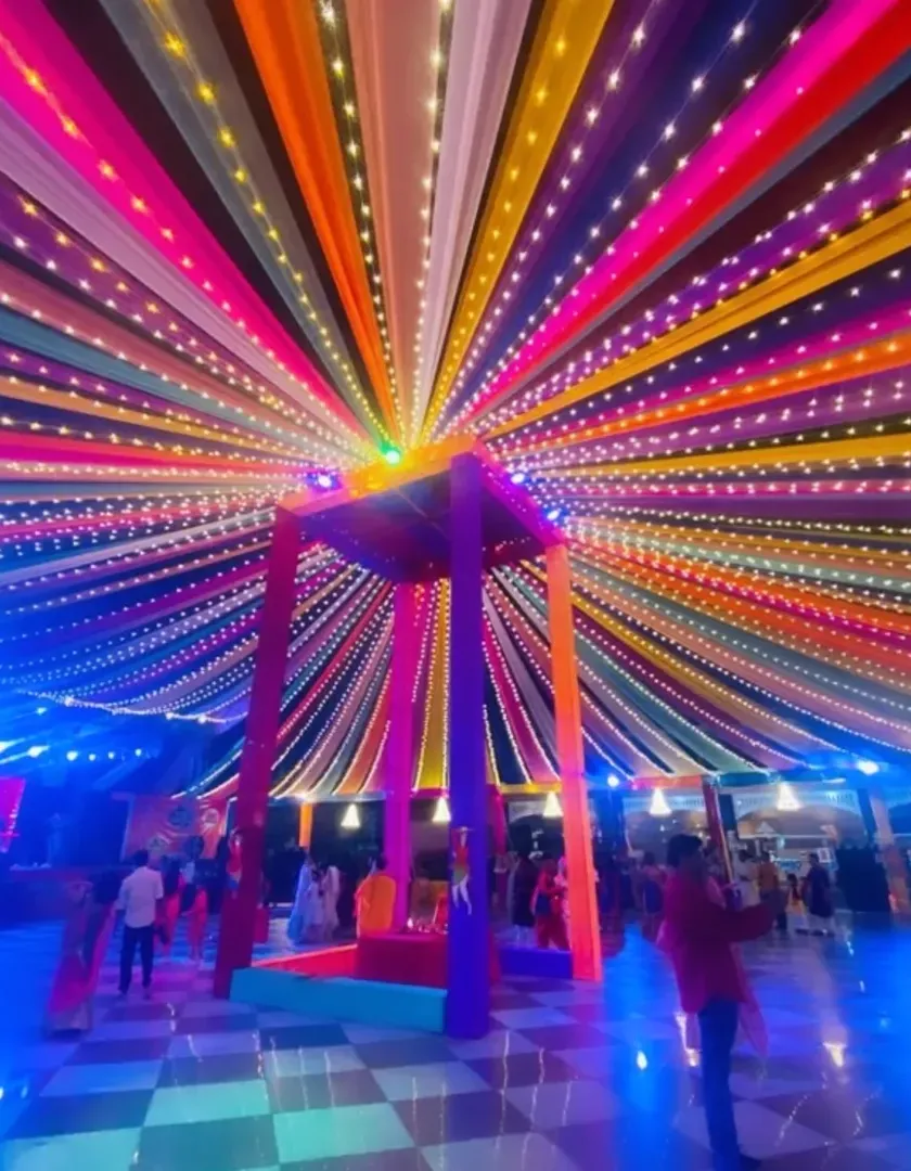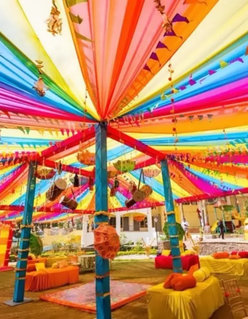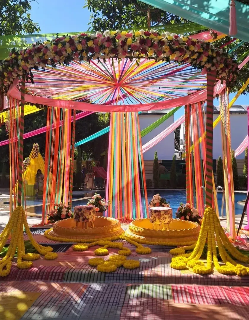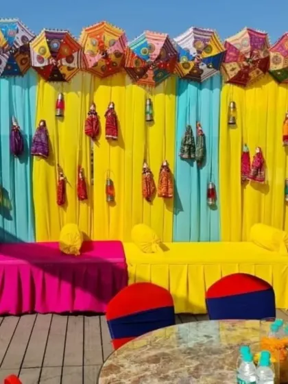 I specialize in creating lively and colorful Haldi and Mehendi environments. My designs range from traditional setups with abundant marigolds (genda) to quirky, boho-chic themes using bright fabrics, Rajasthani puppets, and decorative umbrellas.