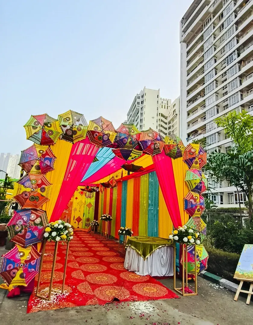 I can turn your home into a beautiful venue for your wedding festivities. My services include decorating the exterior with colorful drapes, setting up welcoming entrances, and adorning indoor spaces like staircases to ensure every corner of your house feels festive.