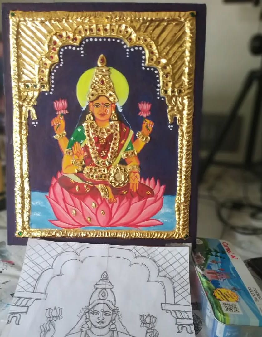 I specialize in creating authentic Tanjore paintings, a classical art form known for its rich colors and real 24k gold foil work. Each piece, whether it's a divine figure like Goddess Lakshmi or an intricate Aishwarya Kolam, is made with traditional techniques like muck work and stone setting to create a 3D effect. These are timeless heirlooms for your pooja room or home.