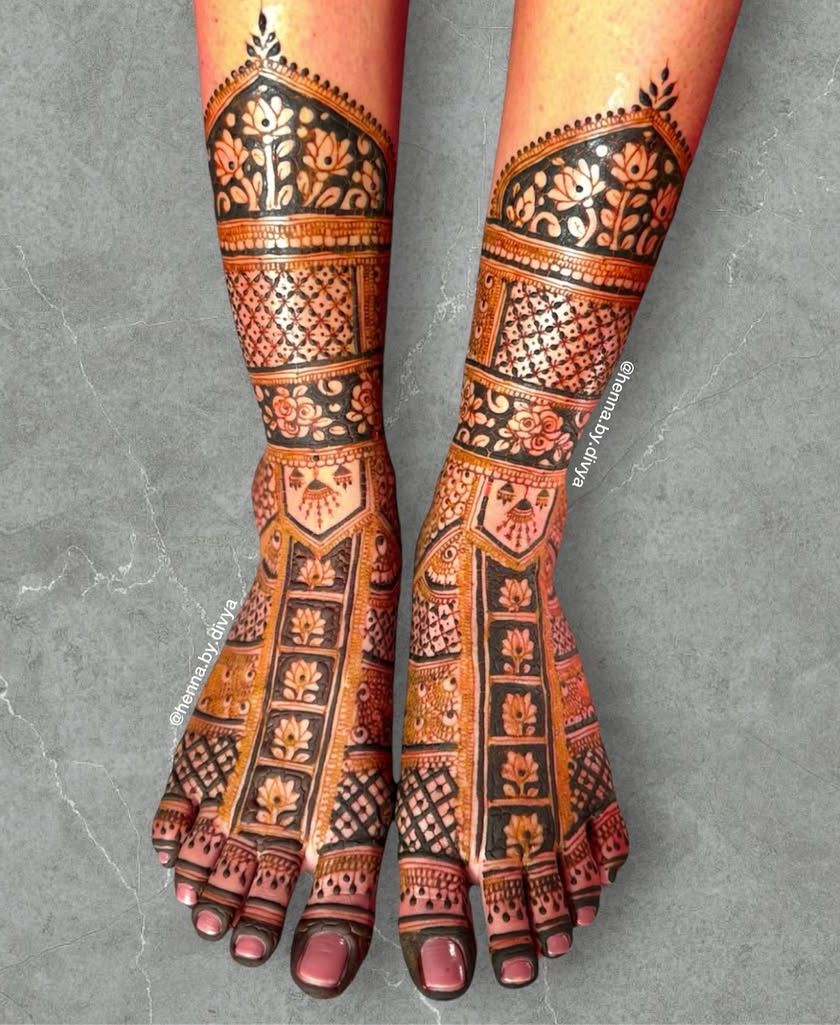 Complete your bridal look with stunning mehendi for your feet. I create designs ranging from delicate anklet styles to full coverage patterns that extend towards the knee, ensuring your feet look beautiful for all the wedding rituals.