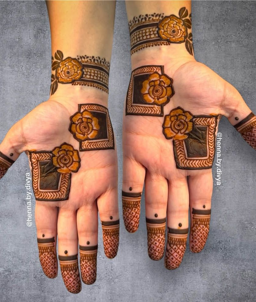 The back of the hands offers a beautiful canvas for statement mehendi. Here you can see a variety of styles, from intricate symmetrical patterns to bold motifs that complement your bridal look perfectly.