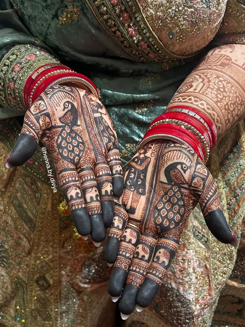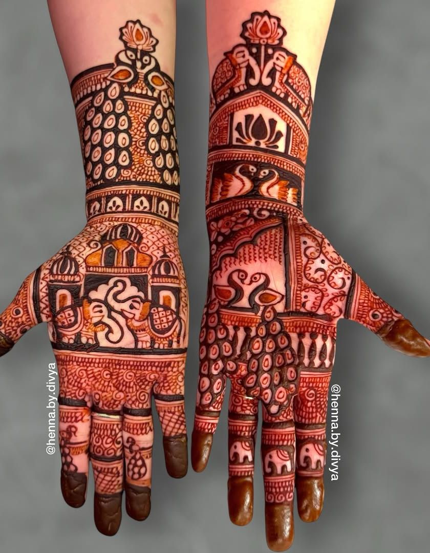 Embrace timeless elegance with classic Indian mehendi artistry. This collection showcases designs rich with royal and traditional elements like majestic peacocks, auspicious elephants, palace architecture, and lotus blossoms.