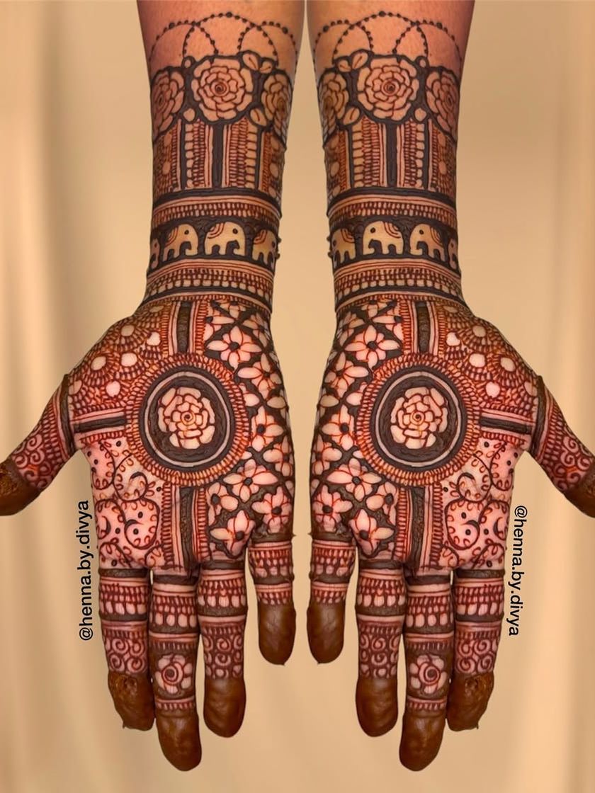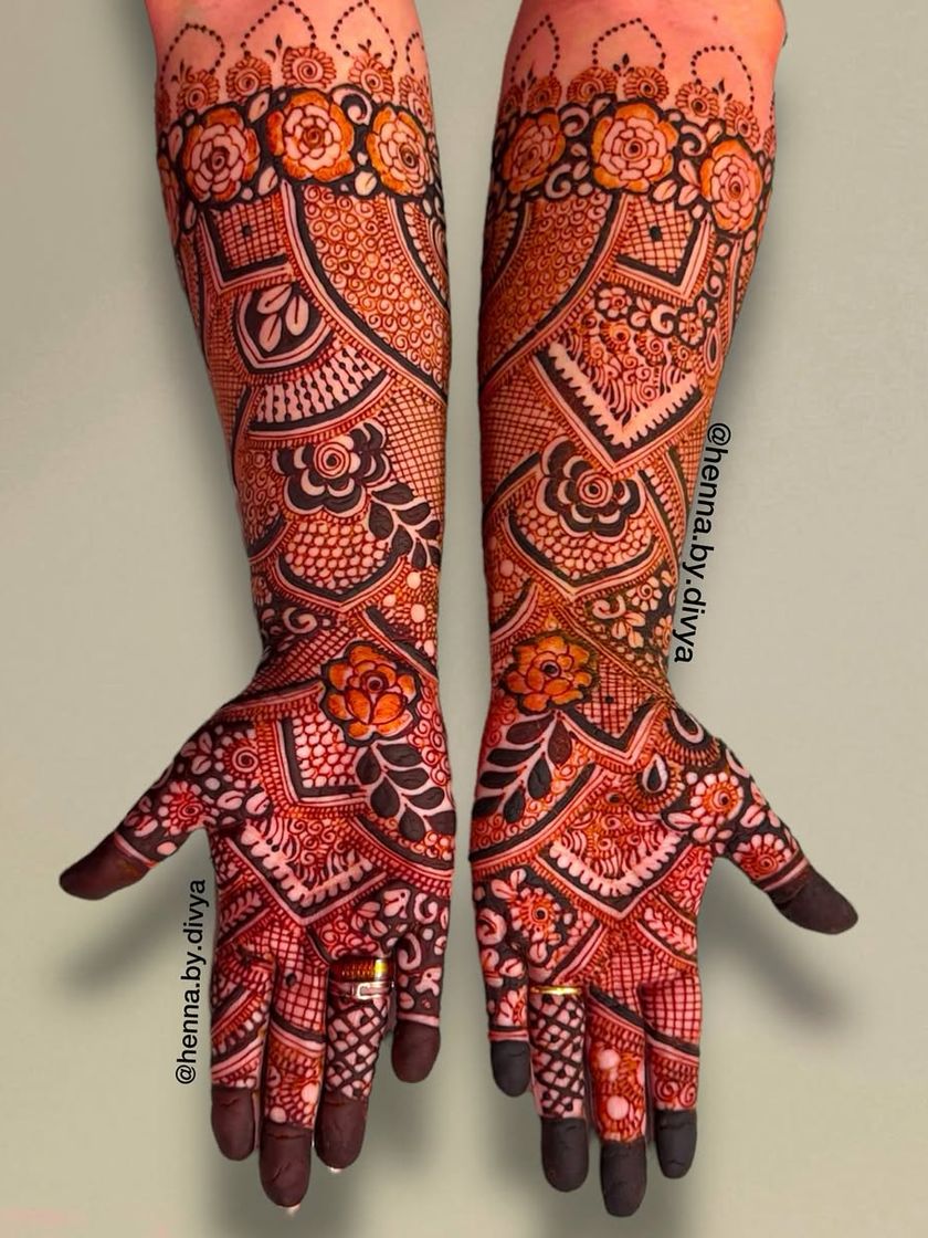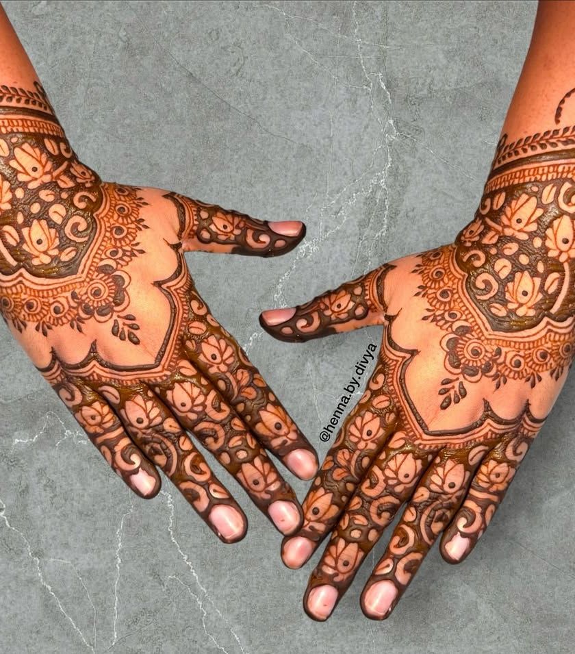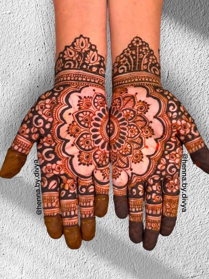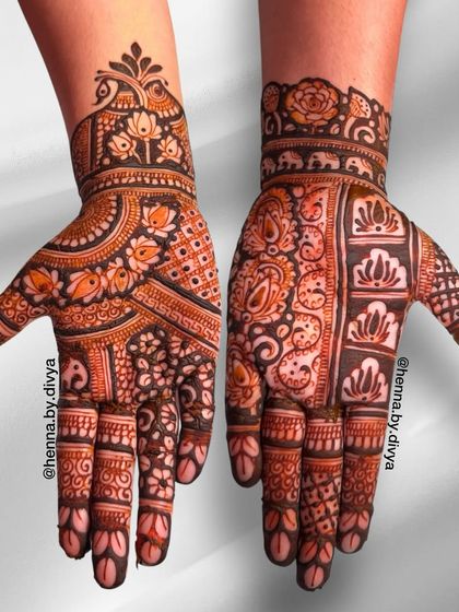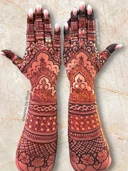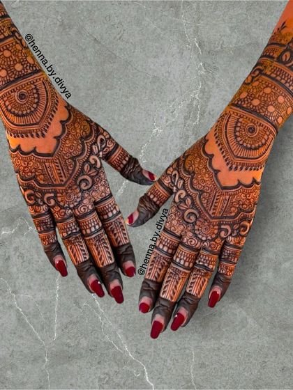 For the bride who wants breathtaking, elaborate henna. These designs feature dense, intricate patterns covering the hands and extending up to the elbows, ensuring a stunning look from every angle. I work with both traditional motifs and modern interpretations for full coverage.