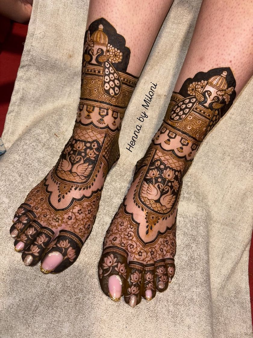 A bride's look is complete with beautifully adorned feet. I offer a range of designs for feet, from simple and elegant patterns to full-coverage bridal styles that match the intricacy of your hand mehendi.