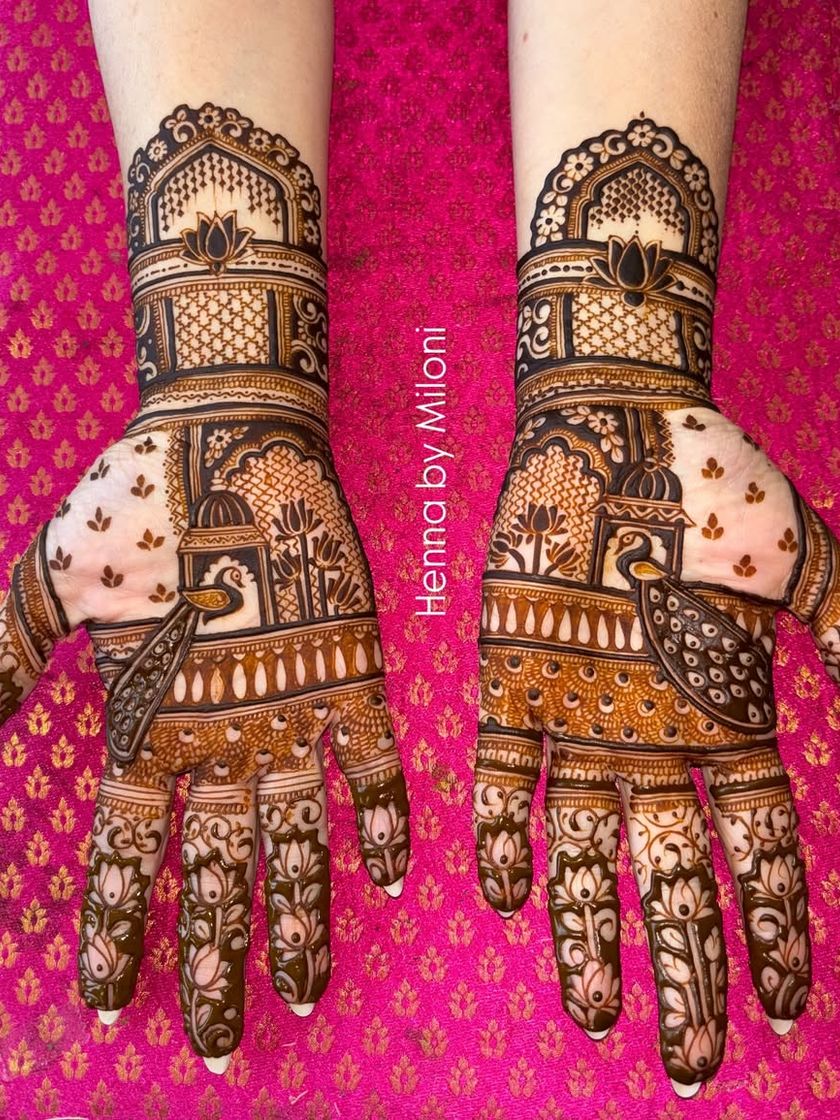 I love incorporating architectural elements like jharokhas, palace domes, and city skylines into my bridal designs. These motifs add a grand, structural beauty to the mehendi, perfect for a bride who wants a regal and unique look.
