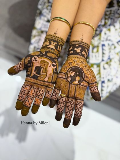 - I specialise in personalised bridal henna that tells your story. Want your love story, wedding date, or portraits hidden in the design? Ho jayega (It’ll be done).