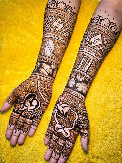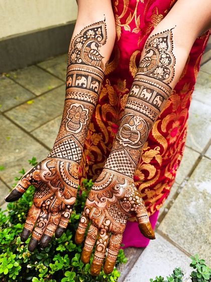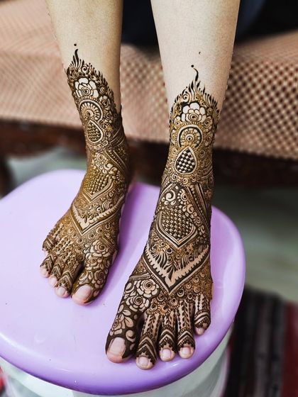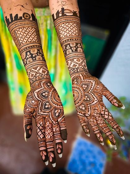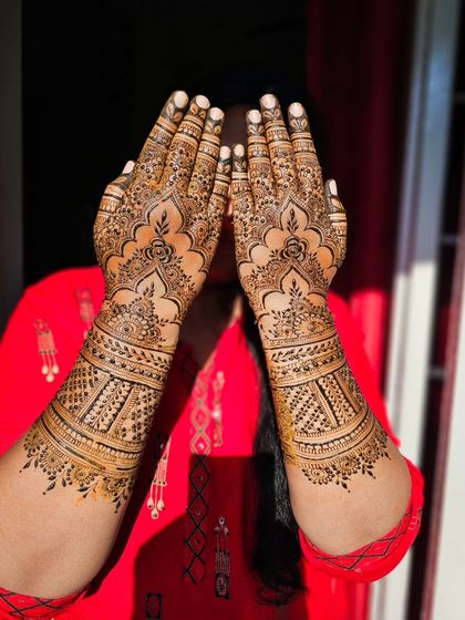 I do bridal henna with custom designs, organic self-made cones, and full coverage for hands, arms, and feet, so you get a deep stain and a relaxed session before your wedding.
