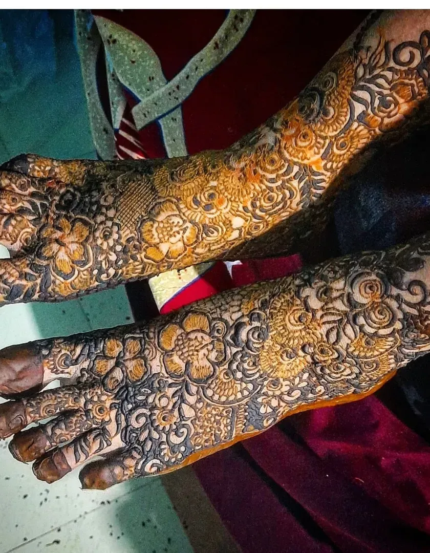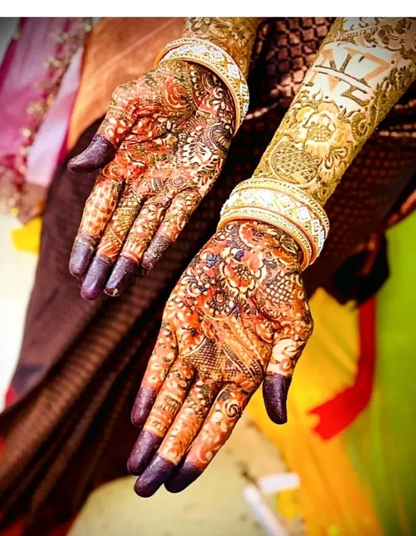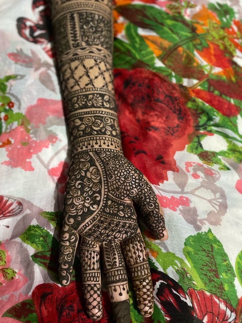This is for the classic bride who wants the full experience. These designs feature intricate patterns covering the hands and arms, often up to the elbow, using traditional Indian motifs like paisleys, mandalas, and detailed jaal work.