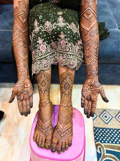 I create custom bridal mehendi with neat, detailed designs using homemade organic henna, covering hands and feet as per your choice, and I share tips for a deep, long-lasting stain.