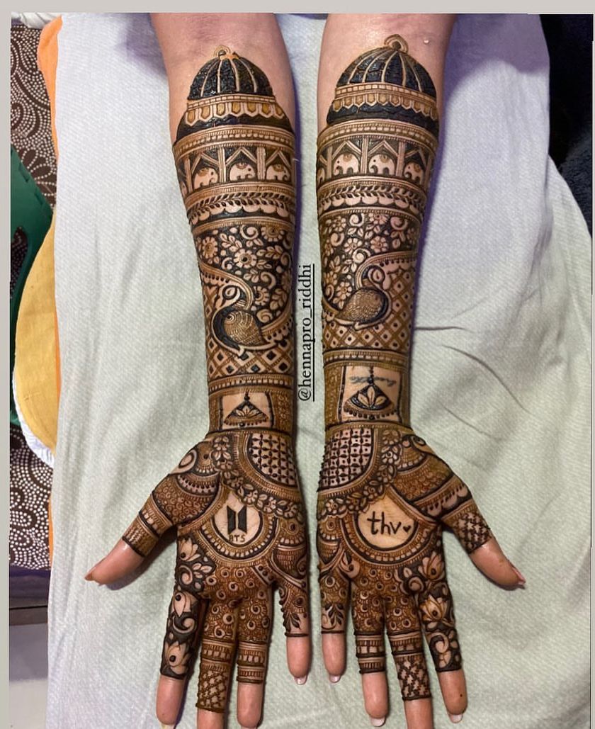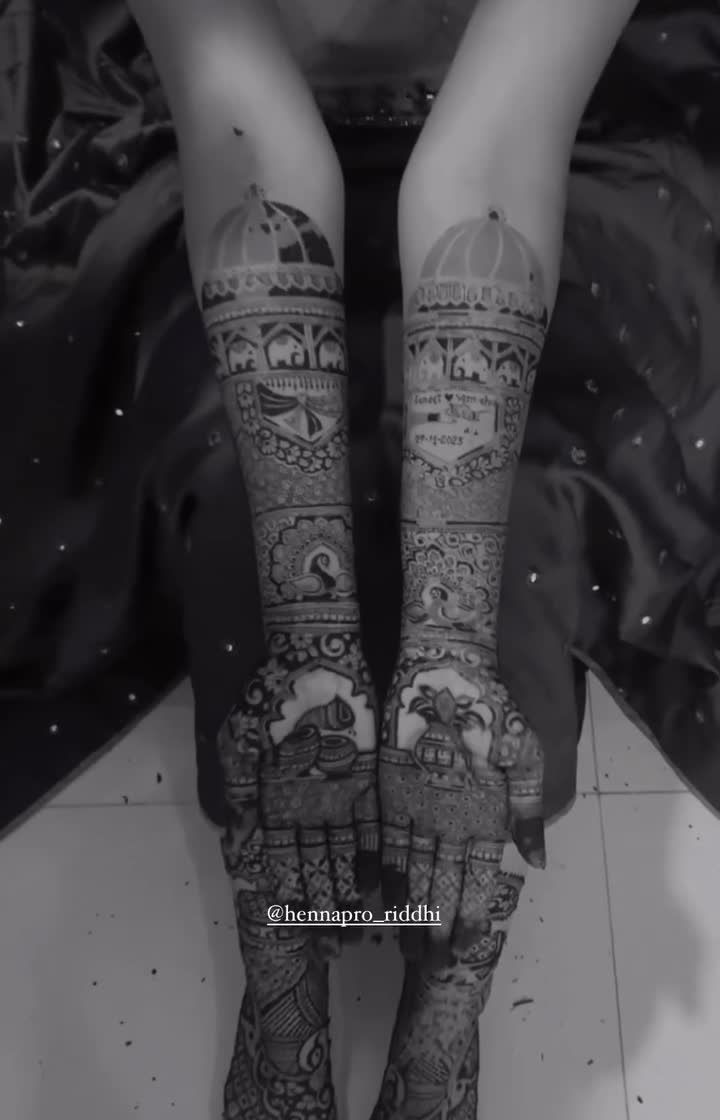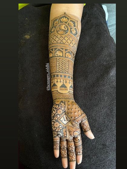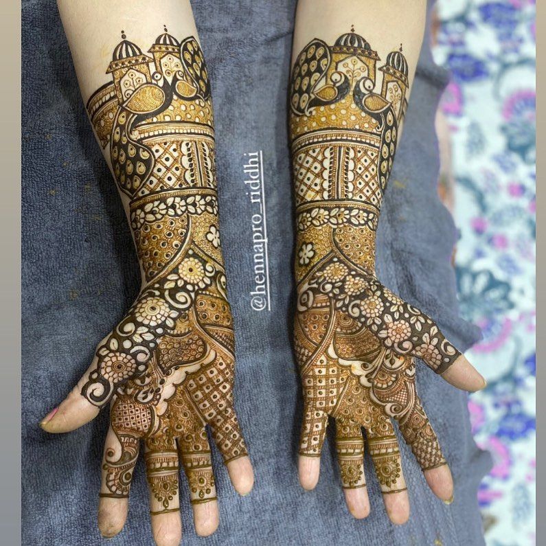 For those who love classic, detailed mehendi, I specialize in elaborate patterns that cover the hands and arms. These designs feature traditional motifs like peacocks, elephants, lotuses, and architectural elements for a rich, bridal look.
