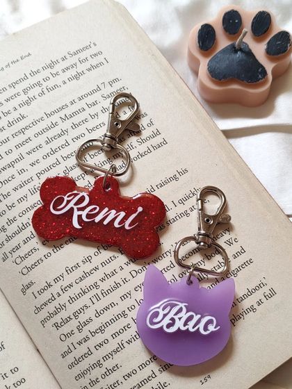 Let me create a special, personalized resin tag for your beloved pet. I can make them in bone or cat shapes with your pet's name, and you can choose from a variety of colors and sparkly glitters.