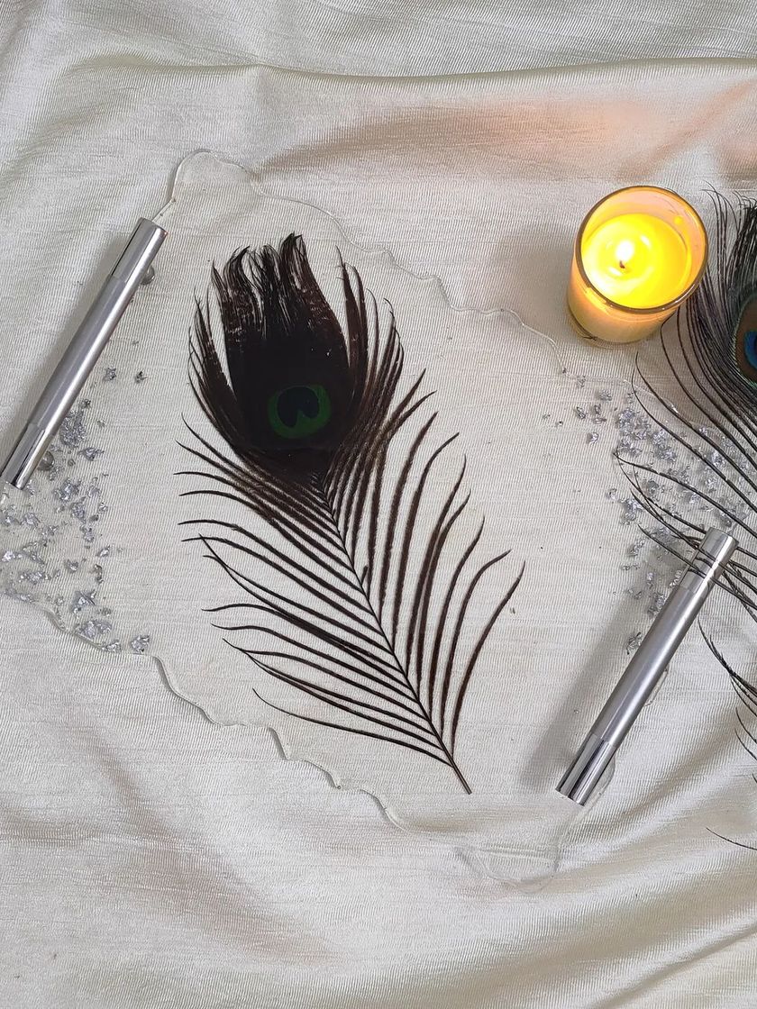 I create beautiful, functional resin art for your home. This includes decorative trays perfect for jewelry or perfumes, and unique book stands, all handmade to match your style. You can choose colors, add peacock feathers, or embed dried flowers.