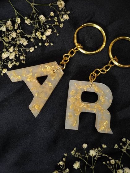We create handcrafted resin keychains in various shapes including letters, crescent moons, stars, and butterflies. Each piece incorporates decorative elements like gold flakes, glitter, and seashells.