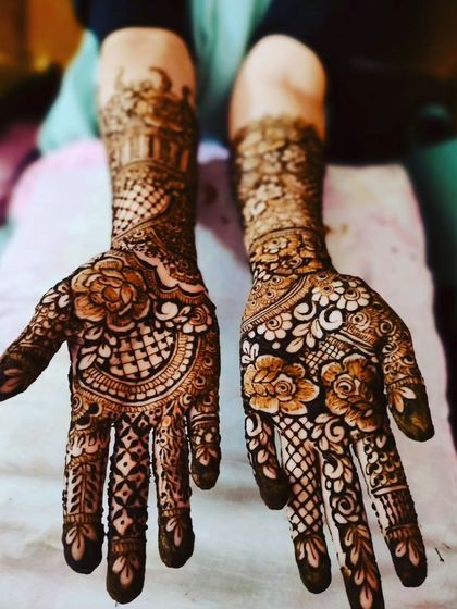 I specialize in creating elaborate bridal henna designs, covering hands, arms, feet, and legs. My designs combine traditional motifs with contemporary elements, featuring intricate patterns like florals, geometric shapes, and cultural symbols.