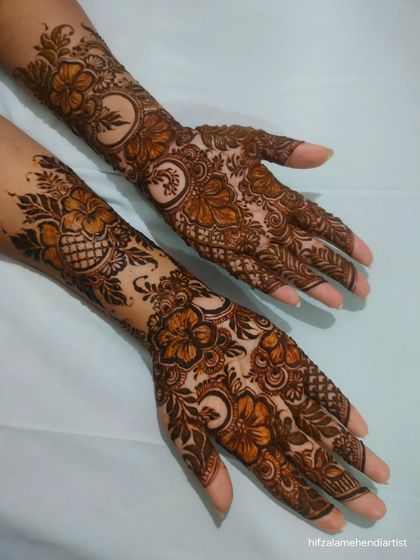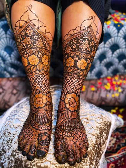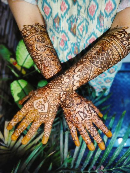 I’m all about thin, fine lines and intricate bridal mehndi designs. You want traditional Indian, Pakistani, Kashmiri, or something trending? We’ll figure out what suits you. Florals, mandalas, checks - I do it all. And if you want, I’ll sneak in the groom’s initials or your names. It’s our little secret.
