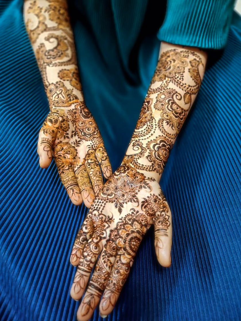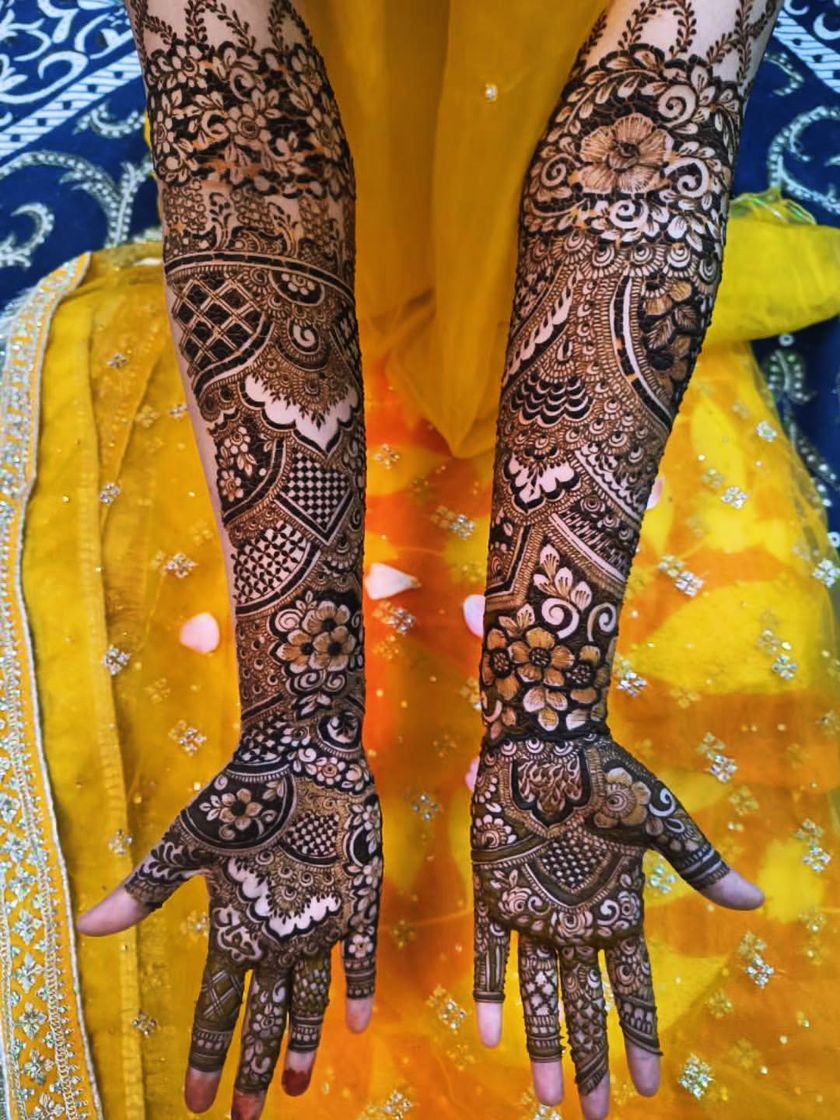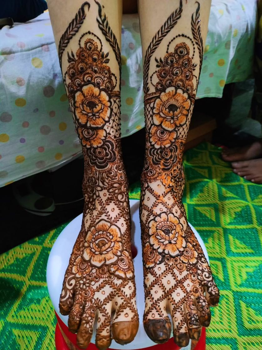 This is my specialty, creating a complete head-to-toe bridal look. I design intricate, matching patterns for both hands and feet, ensuring you feel like a true dulhan on your big day.