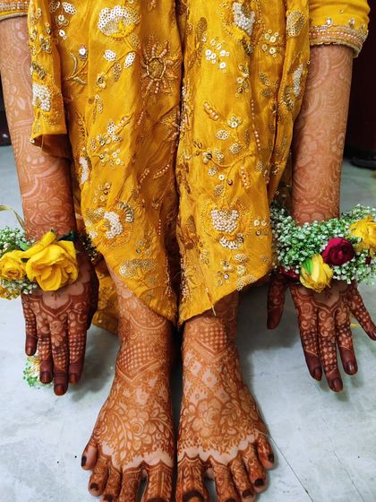A bride's mehendi is incomplete without beautiful designs on her feet. I create elegant and symmetrical patterns that complement the hand designs, ranging from simple accents to full coverage up to the ankles.