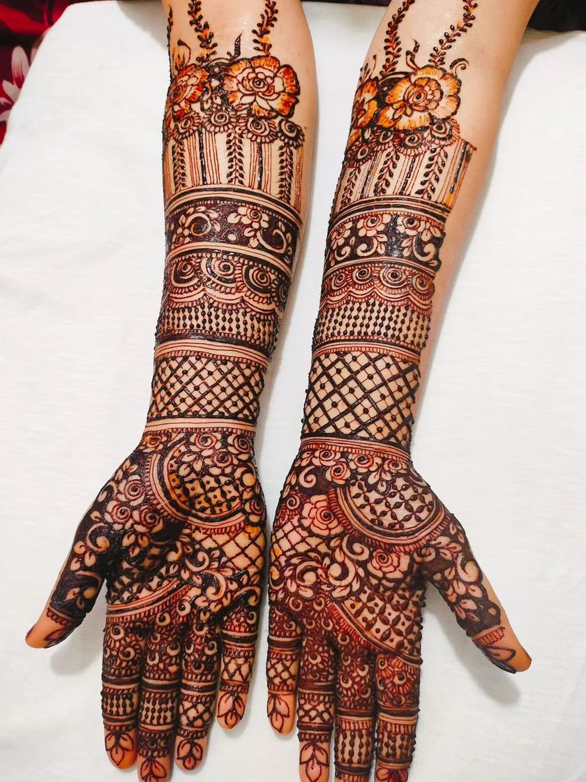 This is my signature style and a favorite among clients for all occasions. I specialize in detailed floral work, including roses, lotuses, and hibiscus flowers, combined with classic paisley vines and delicate fillers to create a timeless and elegant look.