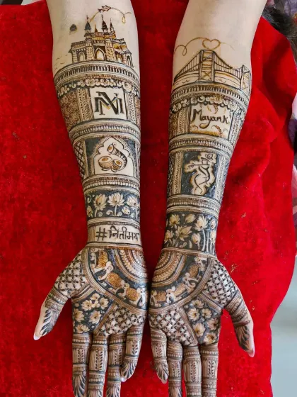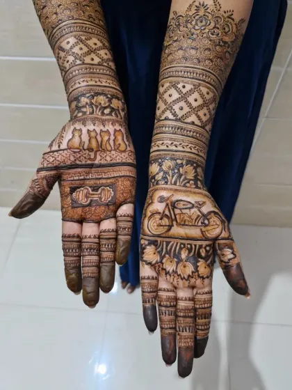 I make custom bridal mehendi with your story, portraits, special dates, and family details using only natural henna and full hand designs, and I come to your home in Andheri or Palghar.